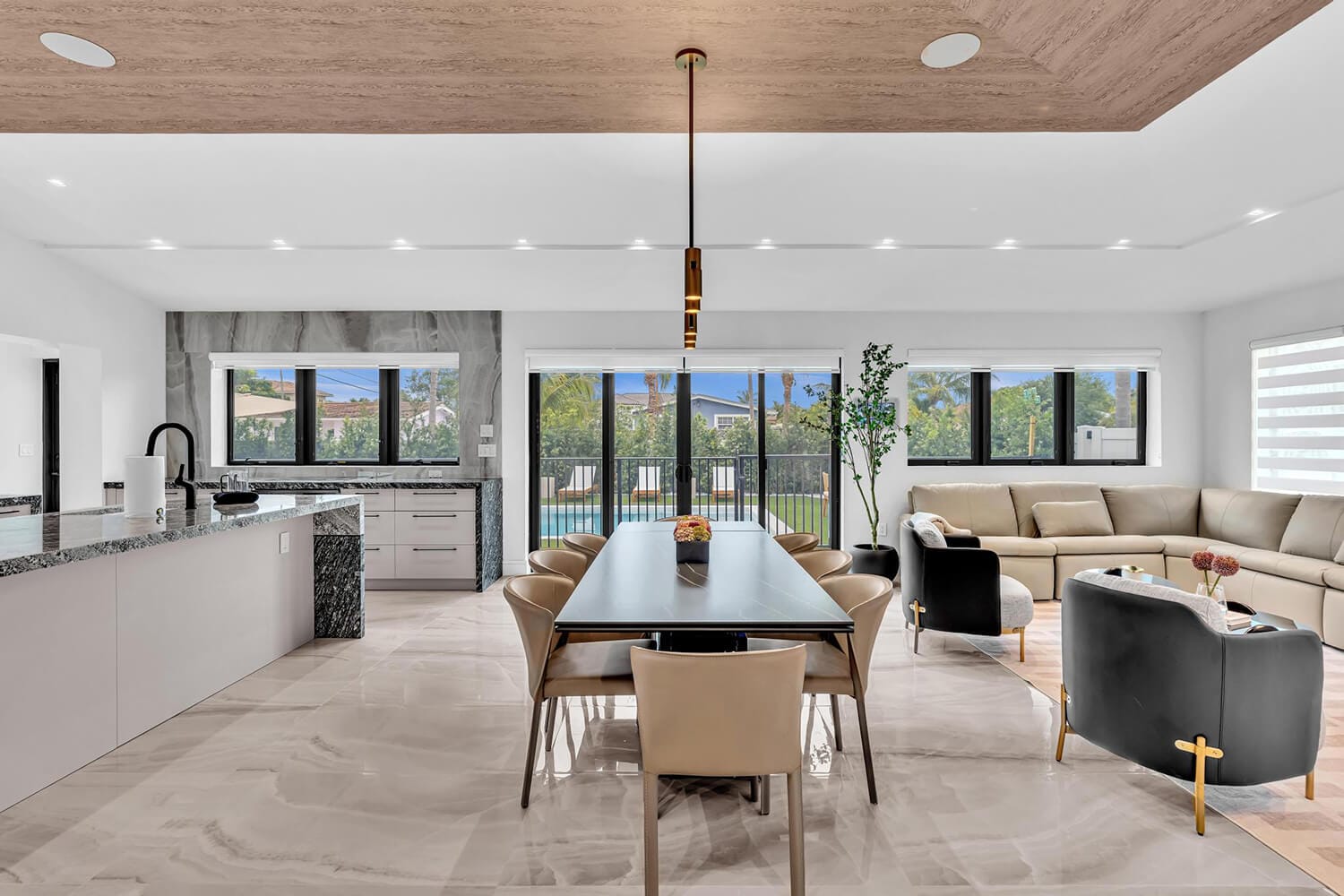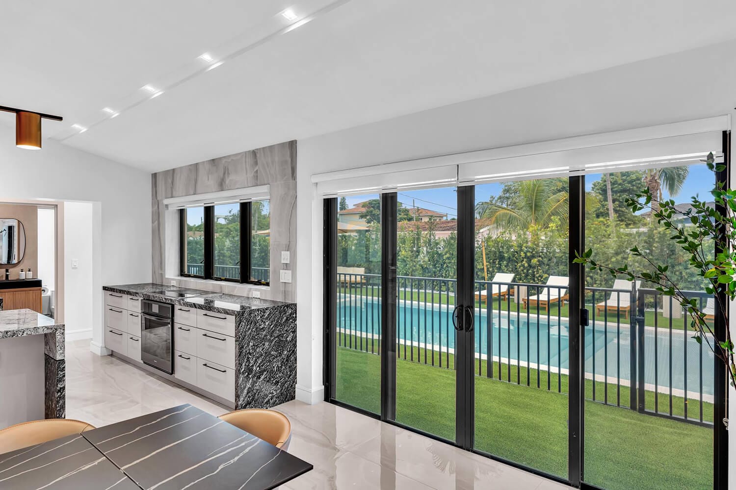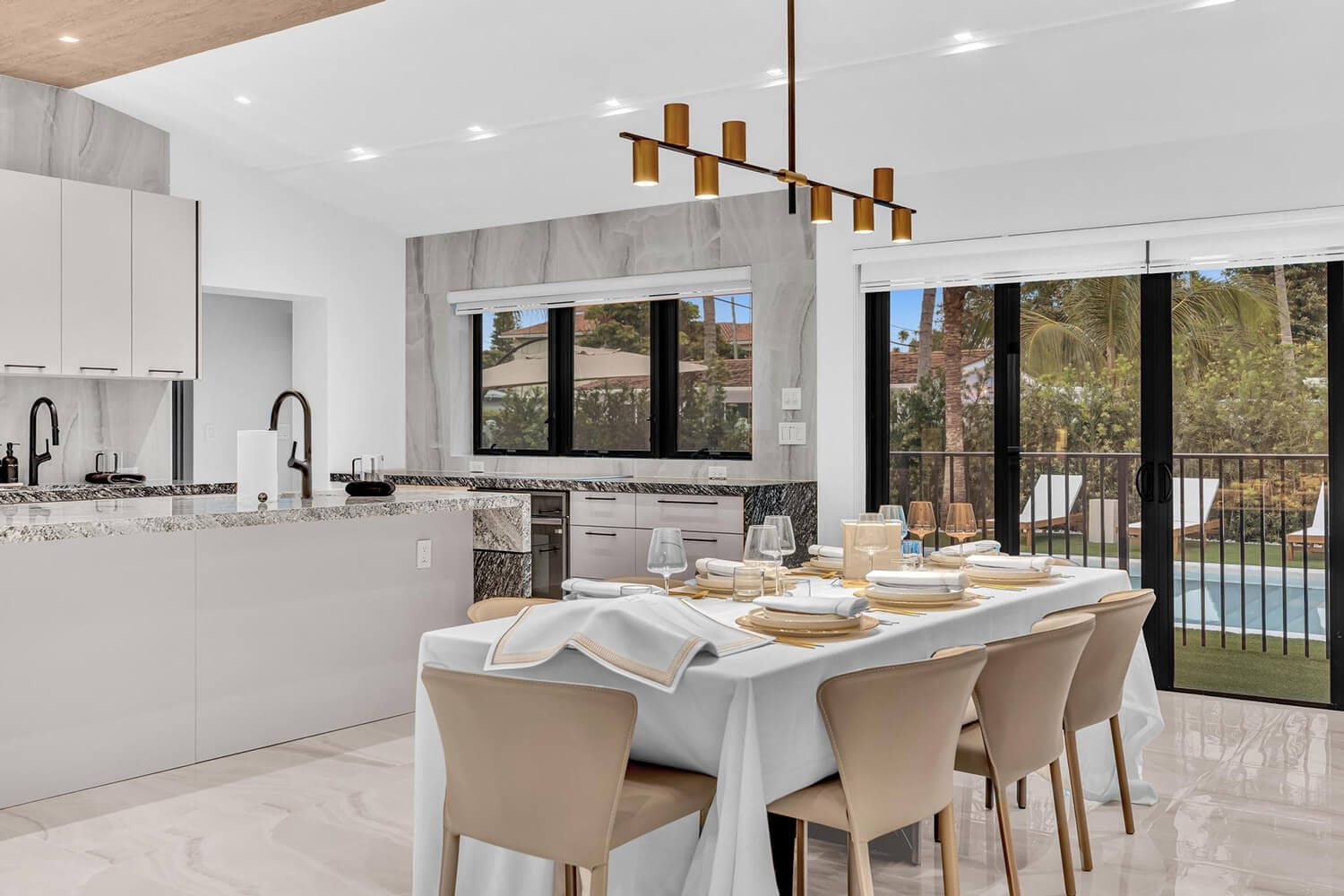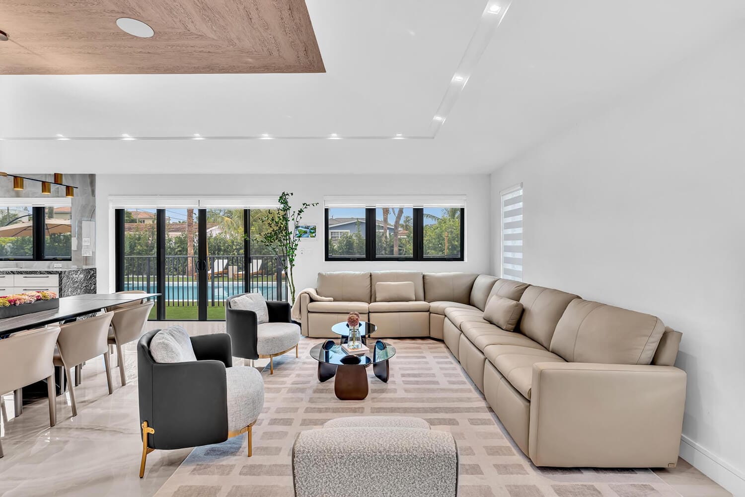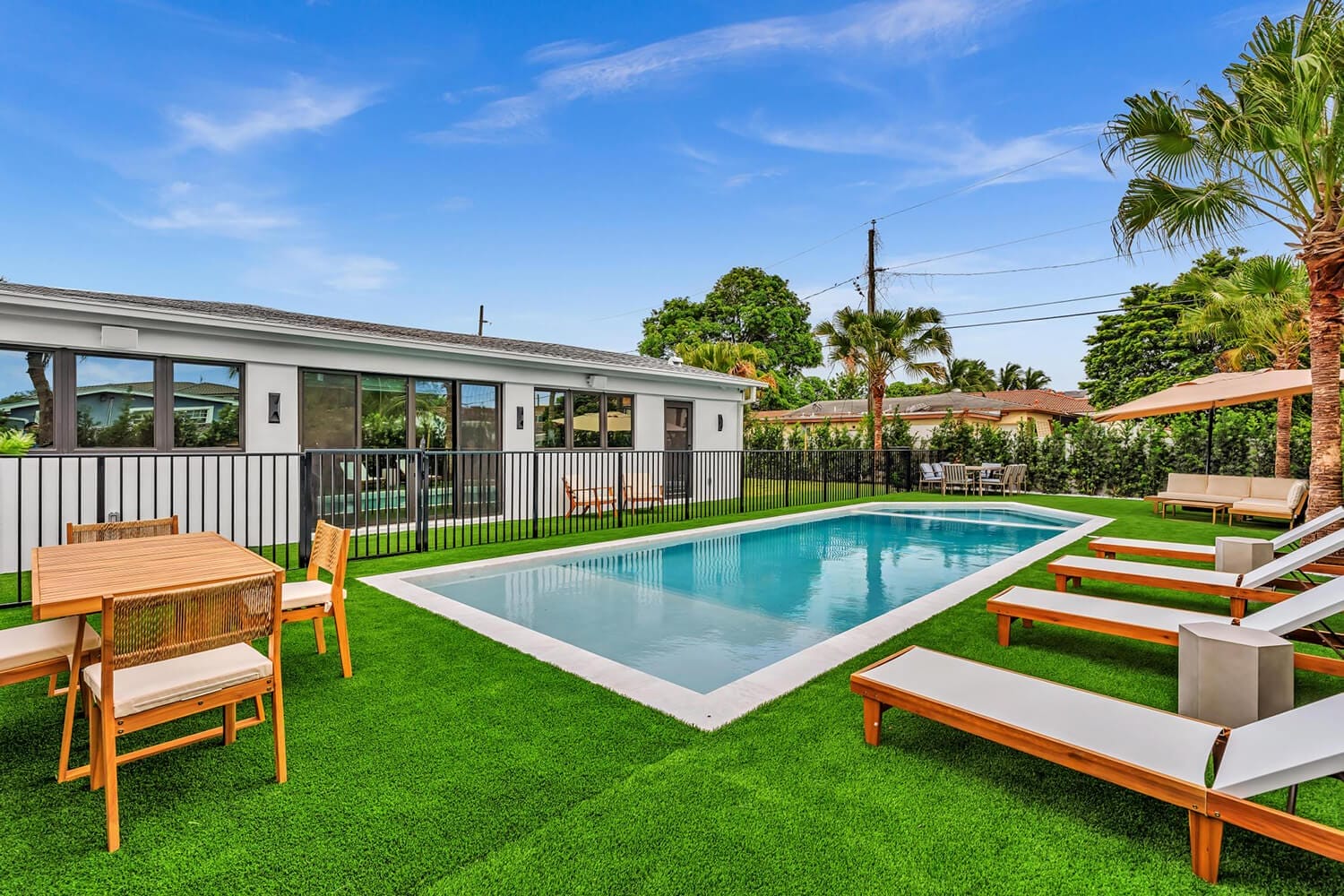 This family-sized villa blends sleek design with tropical living. An iconic pentagon-shaped pool and hot tub anchor the outdoor space, framed by palms and poolside furniture. Inside, you’ll find bright open interiors with natural wood accents, floor-to-ceiling windows, hotel-quality bedrooms, and spa-grade bathrooms. Enjoy local eateries, or cook up your own meals in the chef's kitchen. Everything you need for the perfect Florida escape.-