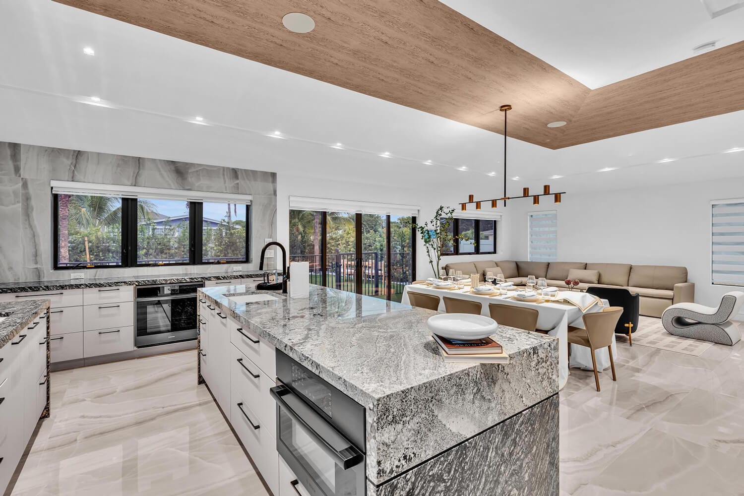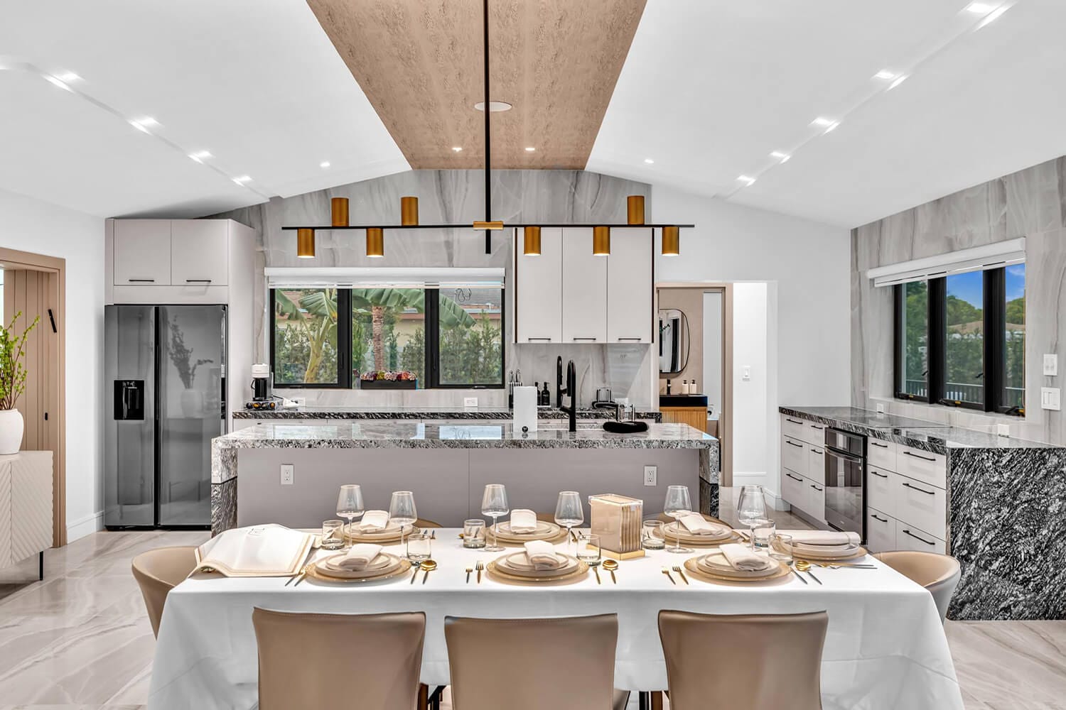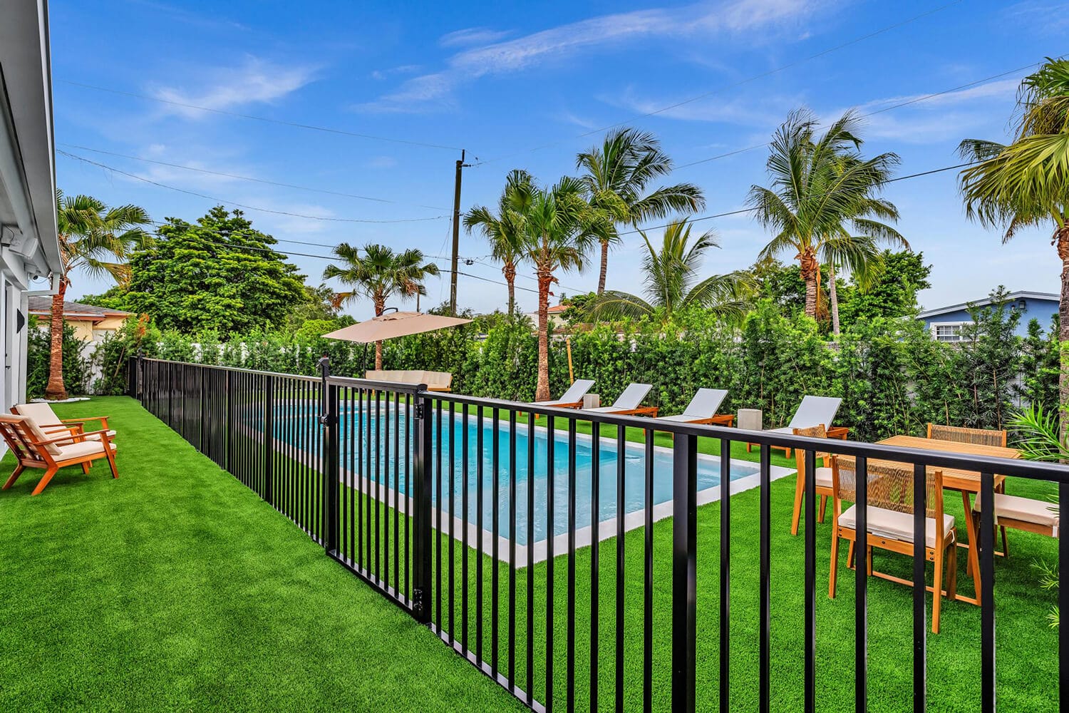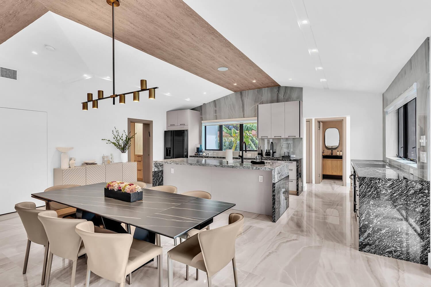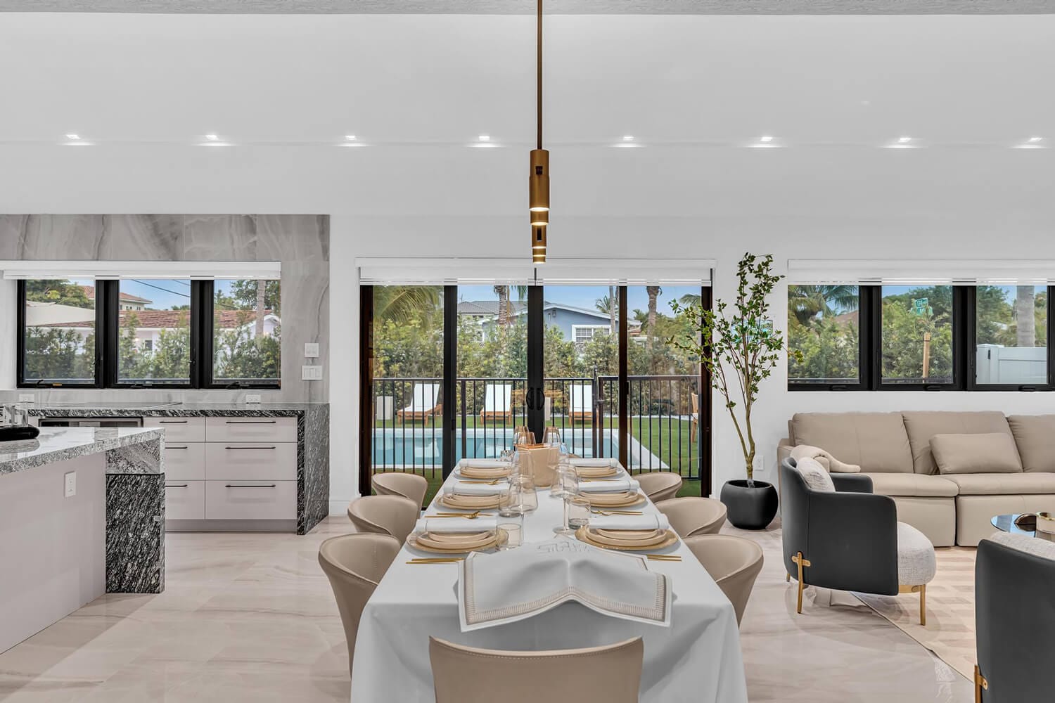 This family-sized villa blends sleek design with tropical living. An iconic pentagon-shaped pool and hot tub anchor the outdoor space, framed by palms and poolside furniture. Inside, you’ll find bright open interiors with natural wood accents, floor-to-ceiling windows, hotel-quality bedrooms, and spa-grade bathrooms. Enjoy local eateries, or cook up your own meals in the chef's kitchen. Everything you need for the perfect Florida escape.-